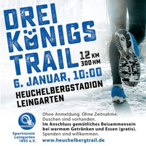 Der alljährlich bekannte 3-Königslauf findet wieder am 6. Januar um 10 Uhr Start/Ziel Heuchelbergstadion (Egarten 2, Leingarten) statt. Wir laufen gemeinsam die vielfältige und landschaftlich reizvolle 12k Trailstrecke „Quick & Dirty“. Die Strecke ist ausgeschildert und es ist keine Anmeldung erforderlich.